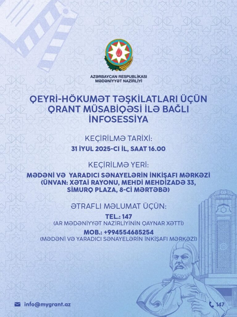Qeyd edək ki, 21 iyul 2025-ci il tarixində Azərbaycan Respublikasının Mədəniyyət Nazirliyi tərəfindən qeyri-hökumət təşkilatları üçün 2025-ci il üzrə qrant müsabiqələri – “Mədəniyyət sahələri üzrə ümumi qrant müsabiqəsi” və “Mədəni və yaradıcı sənayelər üzrə xüsusi qrant müsabiqəsi” elan edilmişdir. Müsabiqələrə müraciət üçün son tarix 4 avqust 2025-ci il, saat 18:00 müəyyən edilmişdir. Sənədlərin qəbulu mygrant.culture.az veb-səhifəsi üzərindən elektron formada həyata keçirilir.